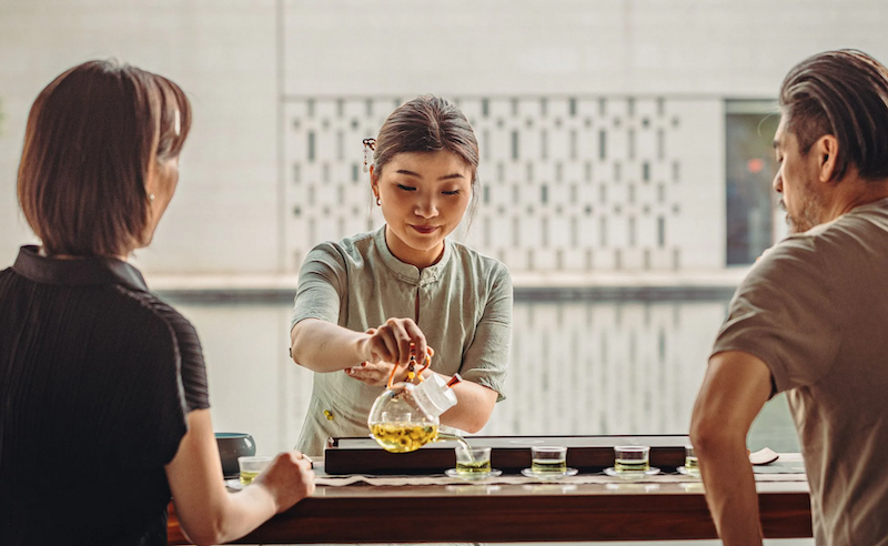 En el ámbito cultural, el hotel propone inmersiones en tradiciones locales como el teñido con índigo, un arte ancestral que ha marcado la identidad visual de Jiangnan. Participar en estos talleres implica sumergir las manos en pigmentos profundos, observar cómo el azul se transforma al contacto con el aire y comprender la paciencia que exige cada pieza textil. Es una experiencia táctil y meditativa que conecta con la historia artesanal del lugar.