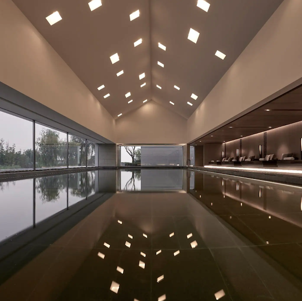 El conjunto arquitectónico evoca una aldea serena. Los edificios, de líneas rectas y superficies claras, se organizan en torno a estanques y patios que capturan el cielo. Los corredores cubiertos conectan los espacios como si fueran callejuelas interiores; los puentes, sobrios y geométricos, cruzan láminas de agua inmóvil que duplican cada fachada. El efecto es casi hipnótico: una sucesión de reflejos donde la frontera entre lo construido y lo natural se diluye.