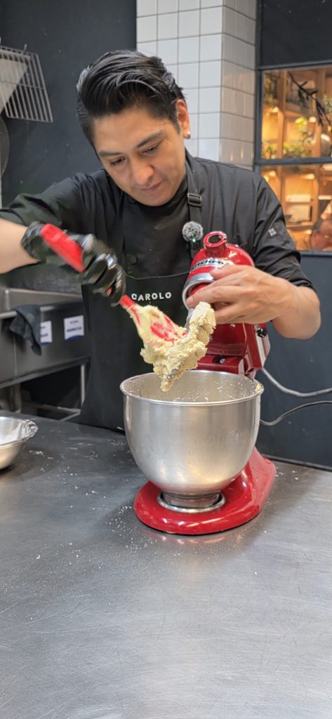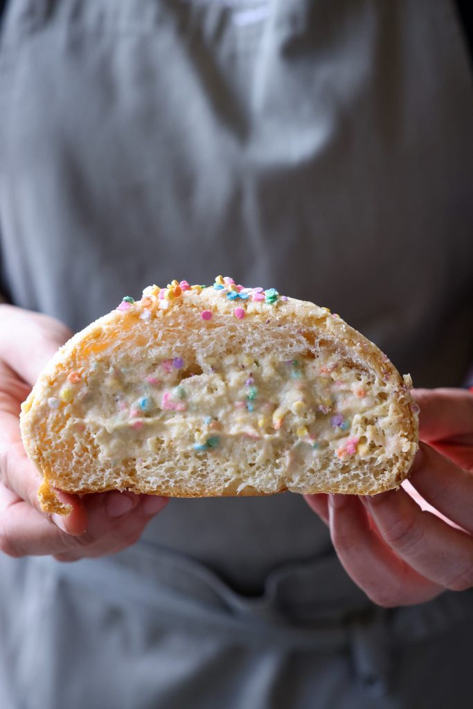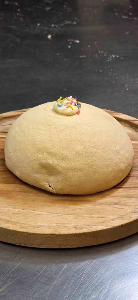 La pieza especial parte de una masa tradicional con relleno de buttercream preparado con queso crema, leche condensada y grageas de colores. La cobertura de vainilla aporta un toque festivo que convierte esta concha en un guiño al pastel de cumpleaños. Además, el chef compartió la receta oficial para que los comensales puedan hornearla en casa.