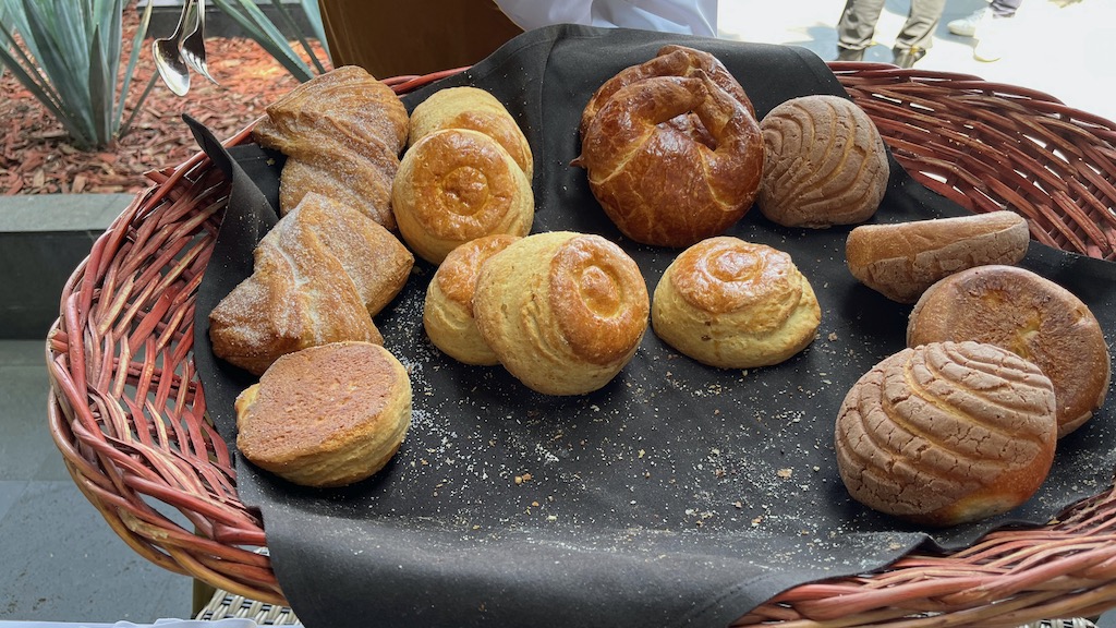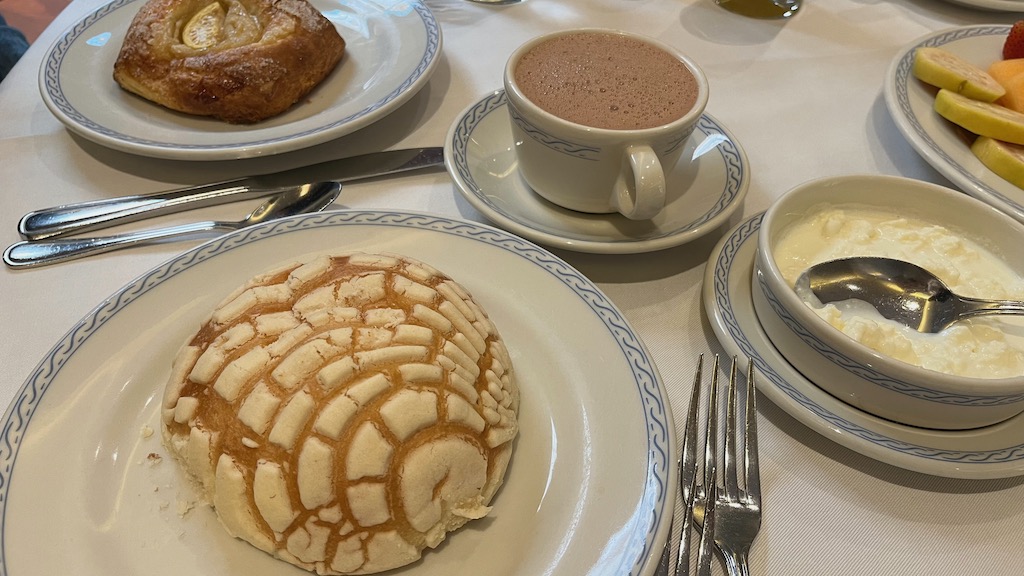 La experiencia comienza con elementos que apelan a la memoria: jugos frescos de fruta, platos con papaya, melón, piña y fresas, café y chocolate espumado servido en mesa, acompañado de pan dulce —conchas— y nata fresca con esa textura apenas aireada. Hay una claridad en la propuesta que se sostiene en la repetición bien ejecutada.