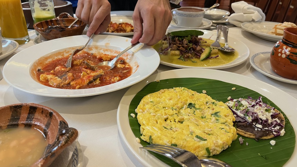 Los huevos con cecina de res, se integran a una salsa roja molcajeteada de carácter profundo, acompañados de frijoles de la olla que equilibran el conjunto desde la sencillez. La tortilla de huevo con escamoles incorpora cebolla picada, chile verde y epazote, y se sirve con un sopecito que completa el plato sin restarle protagonismo al ingrediente central. Por su parte, las enchiladas de lengua —tortillas dobladas rellenas de frijol refrito— se bañan en una salsa verde cocida y se coronan con lengua de res picada, col morada fileteada, cilantro y aguacate, aportando textura y frescura.