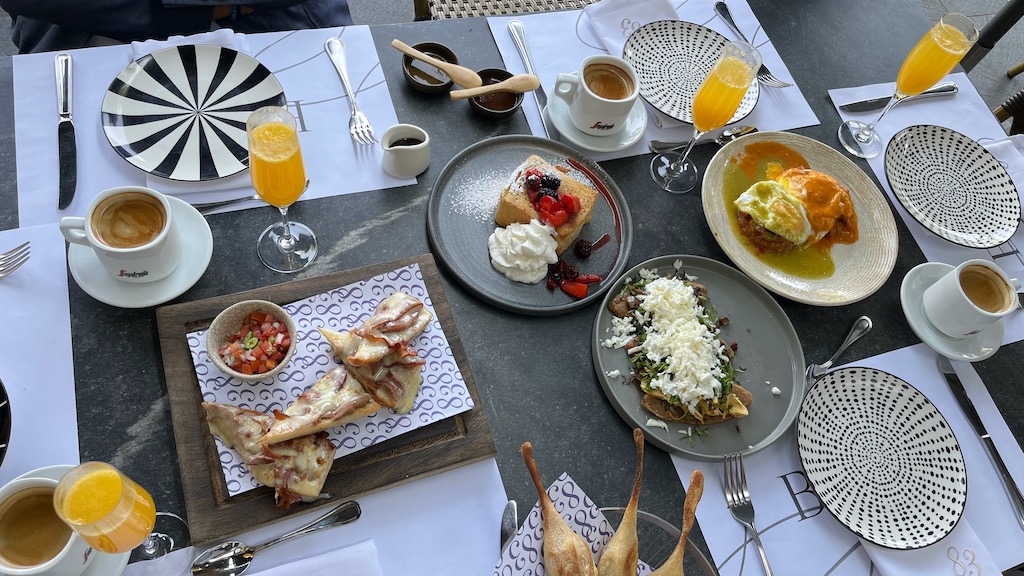 Aquí, el desayuno se entiende desde el compartir. Café americano, jugo de naranja y mimosas acompañan una mesa que se arma al centro. Los molletes con tocino y queso manchego —ese desayuno reconfortante y familiar— se sirven con un pico de gallo de chile, cebolla y jitomate que equilibra cada bocado. El pan francés, con crema montada, frutos rojos y coulis, introduce un contraste entre dulzor y acidez.