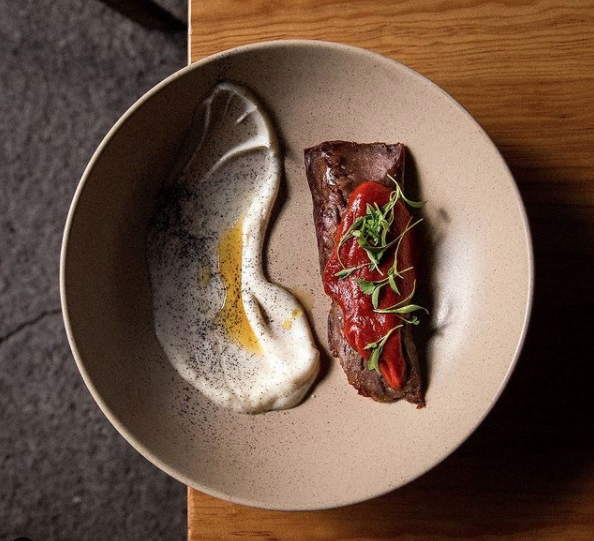 Hemos probado maridajes con tacos, garnachas y todo tipo de platillos, pero nos faltaban los tamales. El agasajo lo puedes comenzar con el tamal de cerdo en salsa verde acompañado de un cremoso de requesón y aceite de epazote. La pareja: un sauvignon blanc de ligera acidez y seco en boca. El perfil de manzana verde del vino hace sintonía con el sutil picor de la salsita verde, la cual no podíamos dejar de comer.