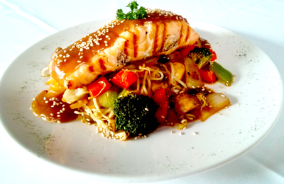 - – Salmón en miel picosita sobre cama de verduras orientales