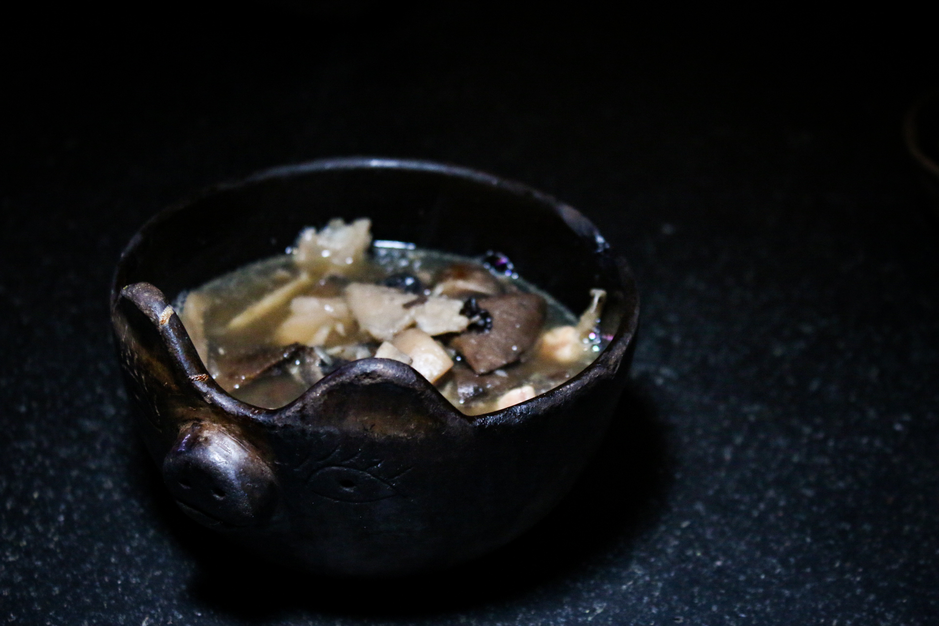 Tras esta explicación y un caballito de mezcal infusionado con muicle, recibimos por primer tiempo una sopa de hongos con médula. Arrancamos con un plato caliente que hace que los recuerdos fluyan y nos reconforten con su presencia en la memoria.