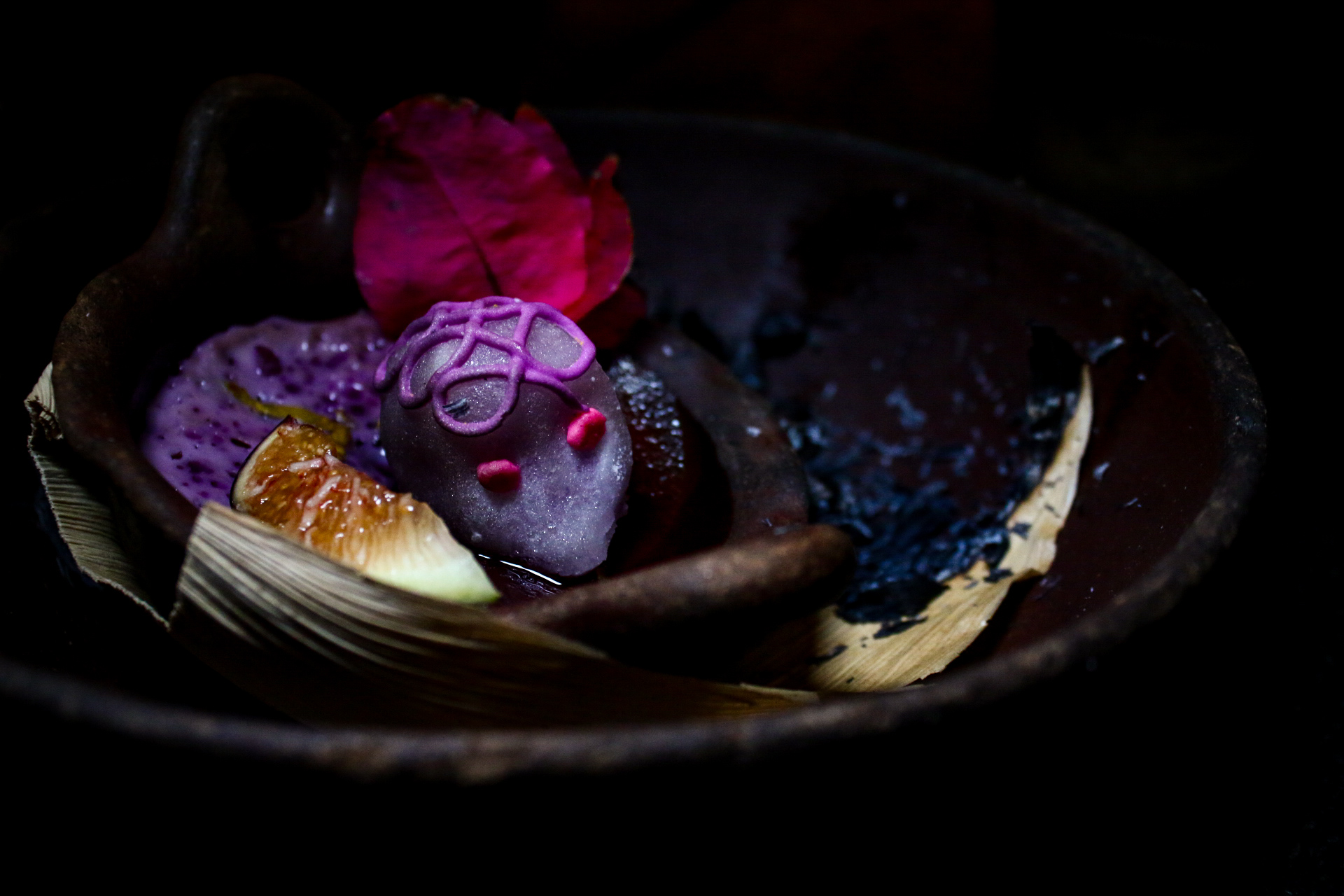Como cena sin postre no está completa, no podía faltar un cierre goloso, que como bien se dice no va al estómago, sino al corazón. Así fue como entre un show de llamas llegó a nosotros una leche cuajada con infusión de muicle y fruta nixtamalizada. Que si no fuera suficiente, estaba maridada con un curado de cempasúchil.