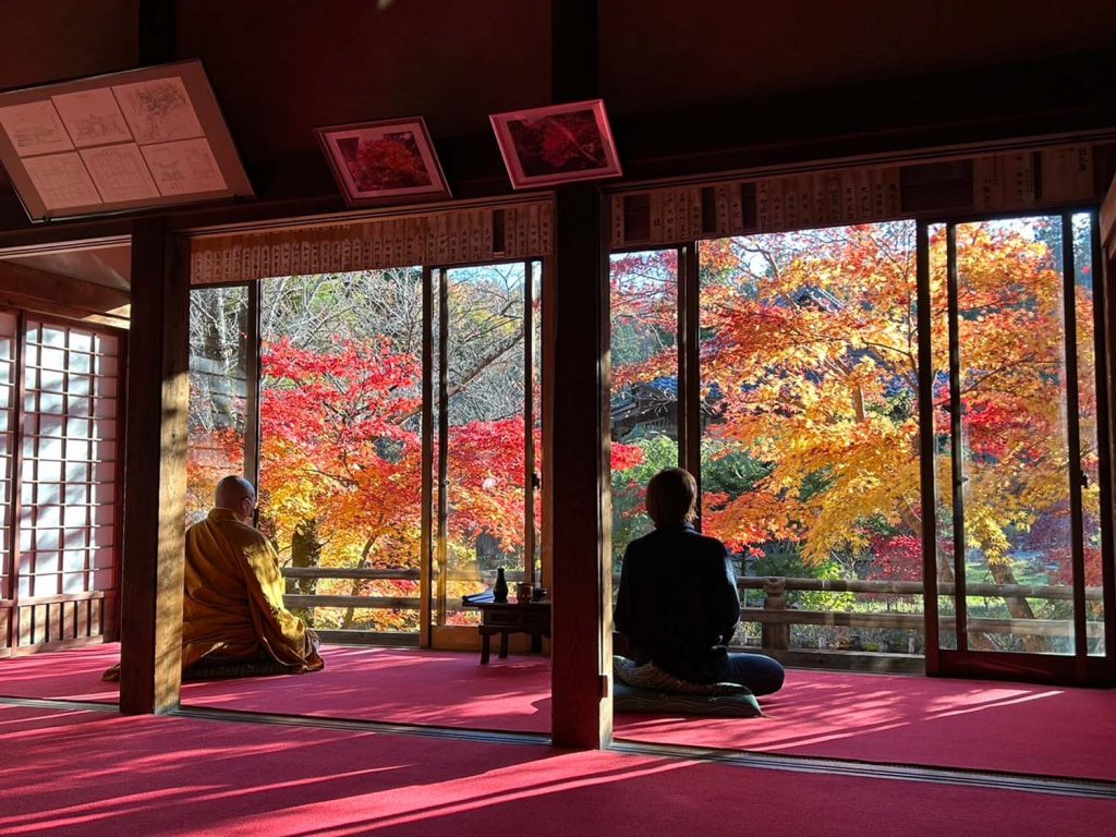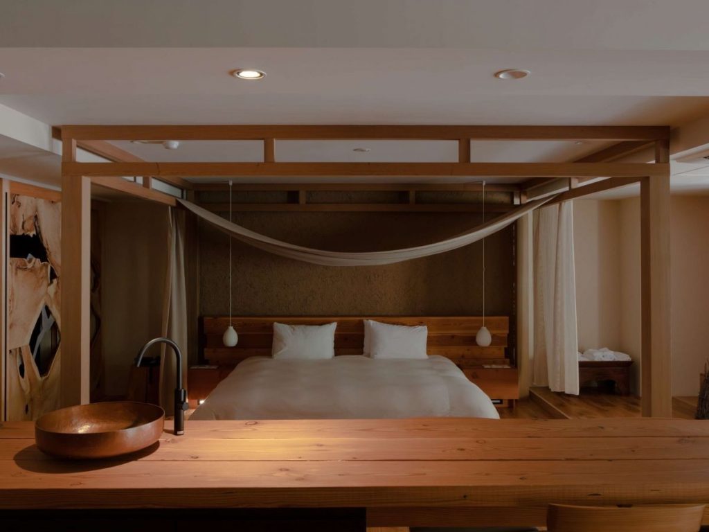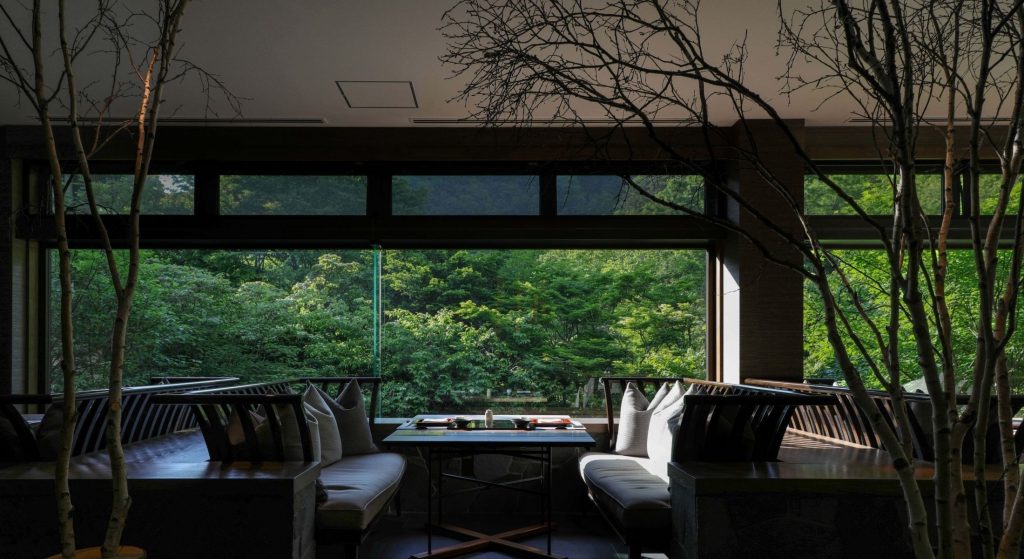 La arquitectura del ryokan integra maderas claras, líneas limpias y ventanales que miran a la textura viva del bosque. Los interiores mantienen una estética suave, sin saturación visual. Las habitaciones se distribuyen entre opciones tradicionales con tatami y futón, y otras de estilo contemporáneo, siempre manteniendo la calidez de los materiales naturales. Desde las ventanas se observa la neblina sobre los árboles y el movimiento lento de la luz a lo largo del día.