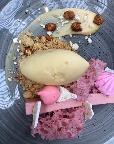 - Mousse de guayaba rosa, crumble de cacahuate y helado de rompope