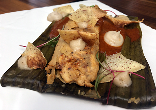 - Tamal muy delgado de conejo estofado en amarillito y puré de camote