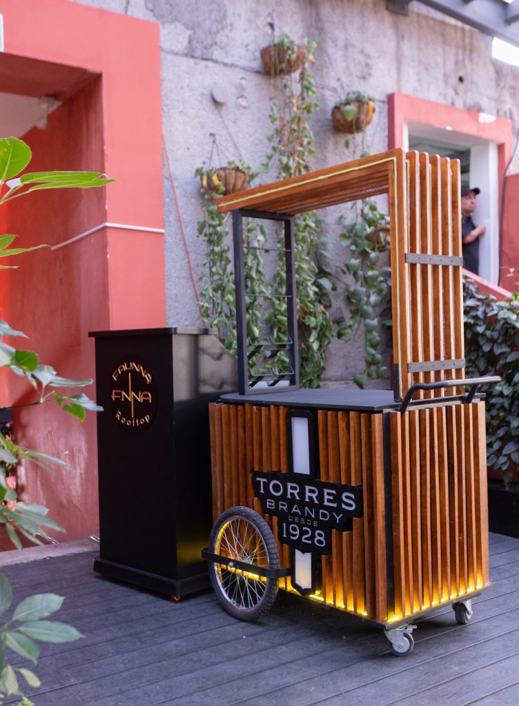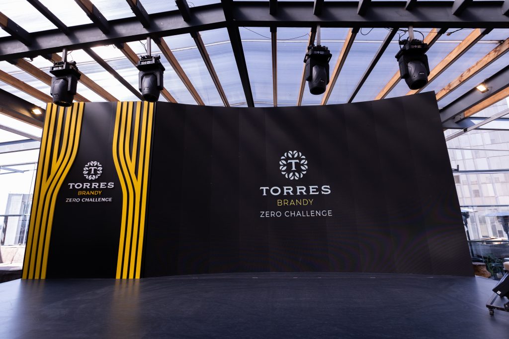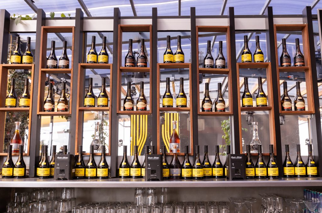 Desde nuestra llegada, el escenario estaba iluminado con los colores y el icónico logo de la marca española. Las mesas exhibían pequeñas pistas que hacían alusión a cada una de las propuestas presentadas durante el evento y, por supuesto, una enorme barra repleta de botellas de Torres Brandy que captaba inmediatamente la atención.