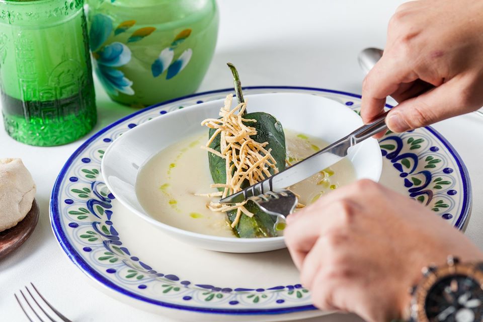 A continuación, un platillo excepcional: el chile pobre. Un deleite que se basa en chile poblano relleno de frijoles y quesillo el cual va ahogado en una salsa blanca de pulque de San Mateo Ozolco, comunidad en Puebla. Esto es algo que en definitiva vale la pena probar ya que el picor ligero del chile se apacigua con el quesillo y la textura espesa y sabor que añade la salsa de pulque, es indescriptible. Nosotros nos comimos hasta lo último chopeando con un pan. El maridaje acertado fue un vino blanco Chenin Blanc de Casa Madero. ¡Se nos hace agua la boca!
