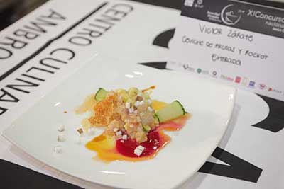 Primer lugar: César Vázquez de Instituto Coronado, con su entrada Tiradito de rockot, con sopa fría de coco y pepino. Y de plato fuerte Lengua con elote tatemado, mole dulce de cuitlacoche y calabazas criollas.