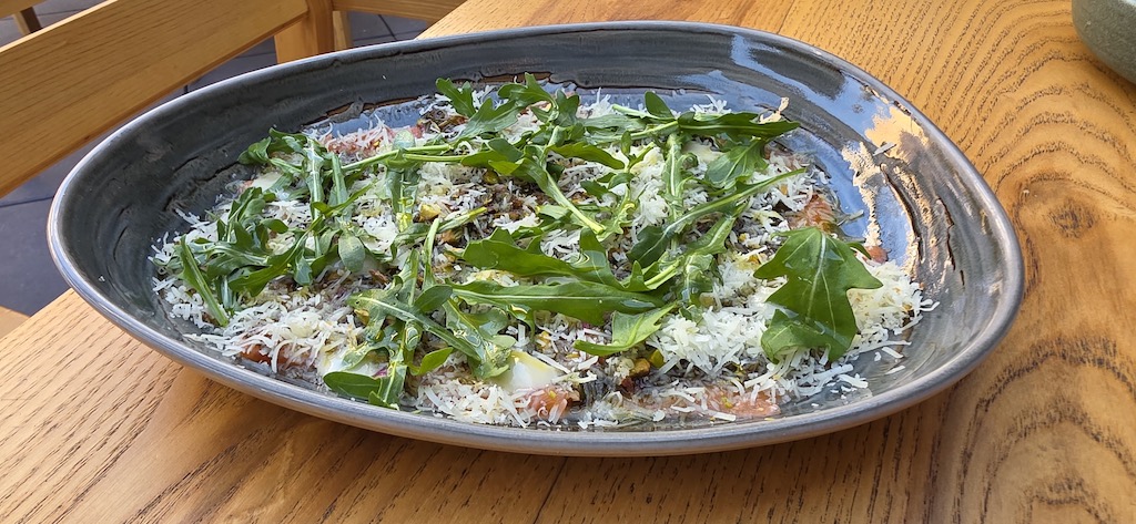Aunque podría pensarse que un restaurante de brasas gira alrededor de la carne, aquí la historia va por otro lado. Por ahora, el menú incluye solo dos cortes, mientras que el peso de la propuesta se enfoca en las verduras, los pescados, los mariscos y varias opciones vegetarianas, que encuentran en el fuego una forma de resaltar su sabor.