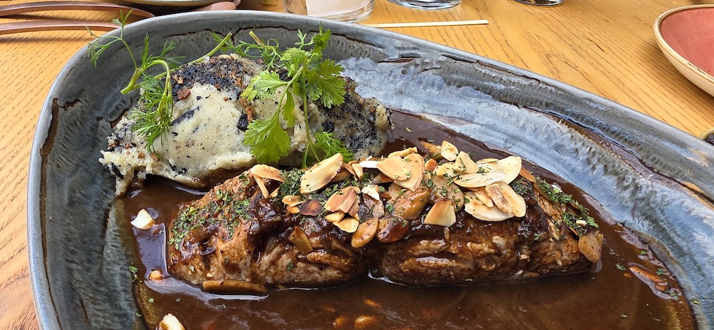 Entre los platos principales, uno de los favoritos es el pescado almendrado, una pesca blanca que se ha ganado su lugar como uno de los más pedidos de la casa. Para quienes prefieren carne, el petit tender destaca por su sabor y por acompañarse con un puré de papa hecho en casa, al que le añaden ceniza de tortilla para darle un toque distinto. Otra opción que vale mucho la pena es el pollo estilo Sinaloa, hecho a la parrilla y servido con una salsa de picor suave que redondea muy bien el plato.