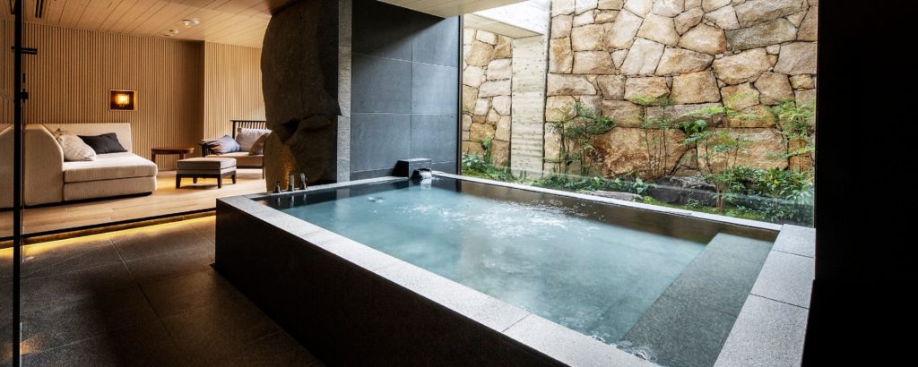 Las habitaciones prolongan esa atmósfera de calma. Cada espacio ha sido pensado para acompañar el ritmo natural del día, con luz suave, vistas abiertas al jardín o al entorno histórico y una distribución que invita al descanso consciente. Los baños, con profundas bañeras de piedra, recuperan la dimensión ritual del agua, un gesto esencial en la cultura japonesa, convertido aquí en parte cotidiana de la estancia.