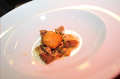 Los aperitivos con los que el galardonado chef recibió a los asistentes fueron pulpa de jitomate con mozzarella y semillas de albahaca, flores de calabaza crujientes, ostiones kumamoto con pulpa de higo y mantequilla aromatizada, verduras deshidratadas y pequeños filetes crudos de atún aleta azul, este último fue sorprendente desde la presentación. Como entrada se sirvió yema de huevo crujiente con hongos morilla.