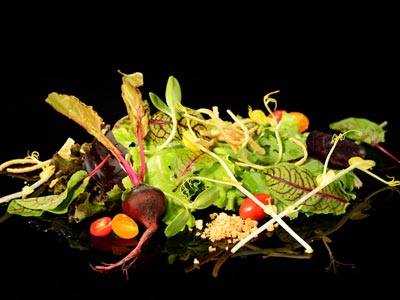 Hojas de sorrel venas rojas, red bib, red butterhead, romana gourmet, lollo verde y cherokee, albahaca dark opal, betabel sangre de toro (cocido en sous vide), brote de chícharo, crumble de maíz, tomate pera rojo y amarillo.
