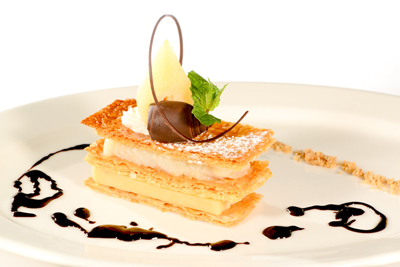 Crujiente de parfait de calvados, peras caramelizadas y salsa de chocolate