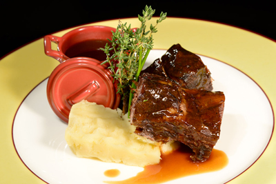 Short rib cab con hueso 450 gramos, fondo oscuro de ternera 500 mililitros, bresa 100 gramos, chile ancho 3 piezas, cebolla 50 gramos, ajo 5 gramos, jitomate 100 gramos, piloncillo 10 gramos, pimienta negra 2 gramos, clavo de olor 1 gramo, comino 1 gramo, papa 120 gramos, crema 40 mililitros, mantequilla 30 gramos, sal cantidad suficiente, nuez moscada cantidad suficiente.