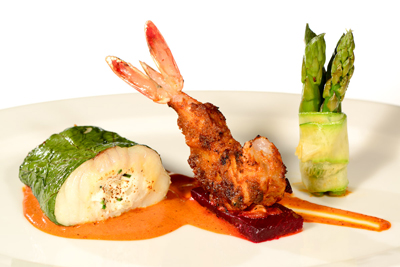 Pescado relleno de alcachofa en hoja santa, camarón al mojo de avellana y chile con pastilla de betabel