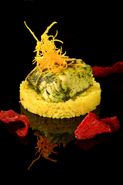 Tronco de robalo (filete de robalo) 180 gramos, cilantro 50 gramos, aceite de oliva 80 gramos, limón 1 pieza, arroz 30 gramos, aceite 15 gramos, ajo 5 gramos, caldo de pollo 60 mililitros, cebolla 10 gramos, cúrcuma 3 gramos, pimiento morrón, camote amarillo en juliana y frito 50 gramos, jitomate confitado 3 piezas.