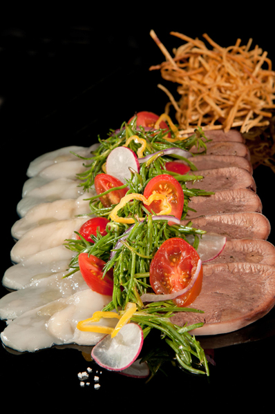 Carpaccio de garra de león y lengua con guarnición de romeritos