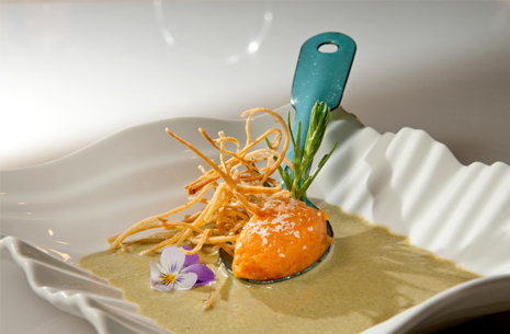 Crema de romeritos ahumados al mezcal y quenelle de camote