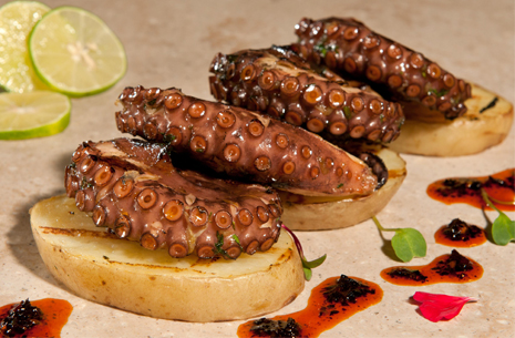 Pulpo (de 2 kg c/u cocidos en agua con hierbas de olor) 2 piezas, aceite de oliva ½ taza, ajo machorallado 1 pieza, cilantro picado 4 ramas, sal de mar cantidad suficiente.