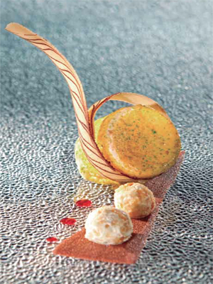 Crujiente de pasta phyllo y nuez de macadamia Pasta phyllo 4 hojas, mantequilla clarificada 60 mililitros, nuez de macadamia molida 5 gramos.