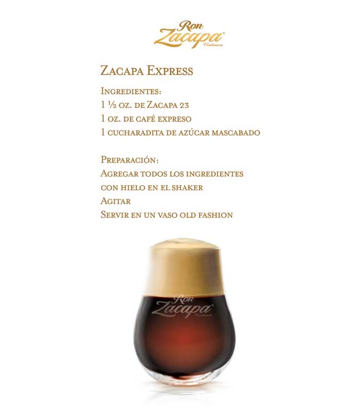 En la antigua Habana, los hacendados españoles, solían tomar un café acompañado de una copa de Ron. Cuando debían tomarlo rápidamente, lo mezclaban y lo denominaron café de “carajillo” (por lo rápido que lo tomaban). Zacapa ofrece una versión, donde las notas de caramelo y chocolate, se mezclan perfectamente con el tostado del café y el dulzor del azúcar mascabado.