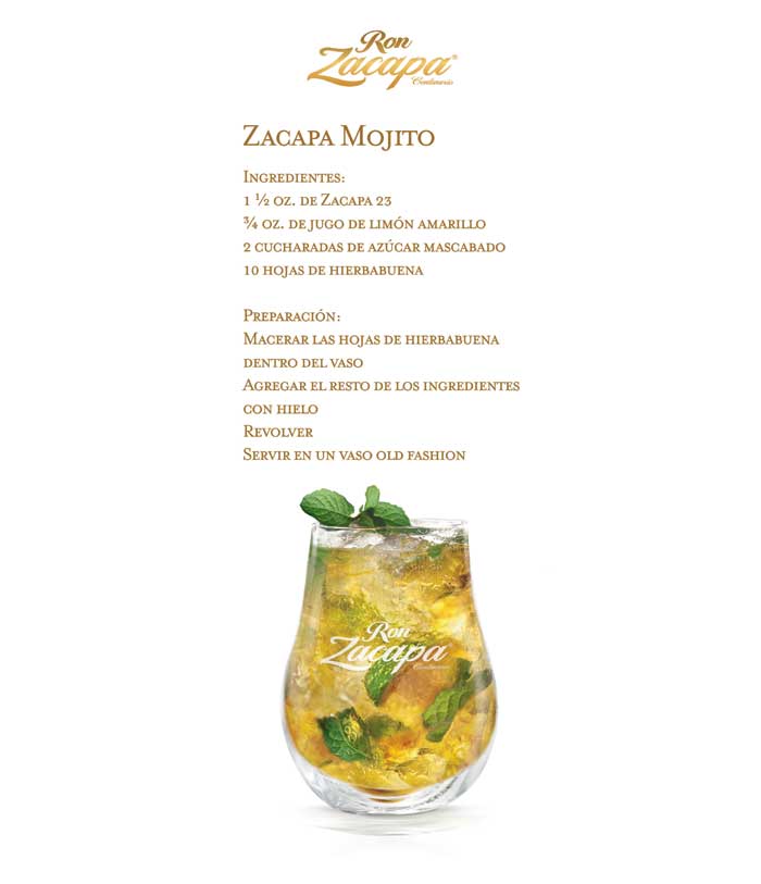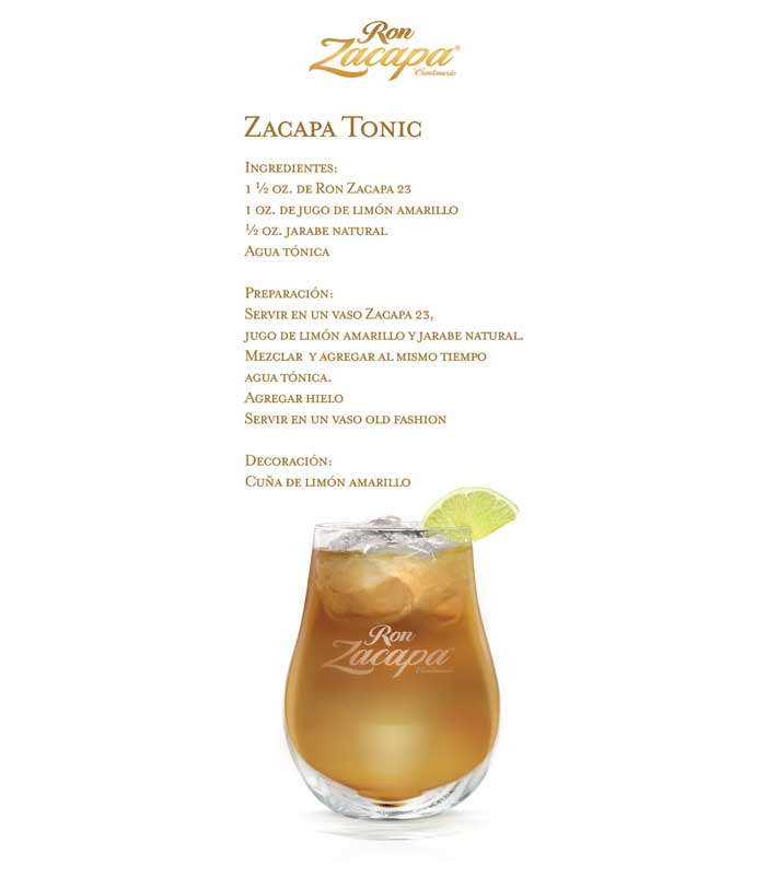 Ron Zacapa 23 y un poco de café son la mezcla perfecta para consentirnos en esta temporada de frío con el “Zacapa Express”. Para aquellos que buscan lo tradicional “Zacapa Mojito” es un clásico para esos festejos de año nuevo. Otro exquisito coctel para disfrutar de esas ricas cenas es el “Zacapa Tonic”, el cual con las propiedades del agua tónica son el complemento perfecto para deleitar nuestro paladar.