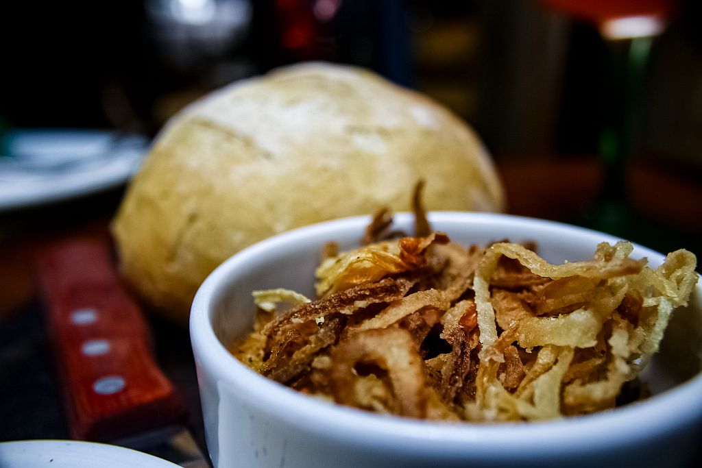 Pero bueno, dejemos nuestro oasis líquido para pasar con los alimentos, mismos que abren con un pan casero, acompañado con cebolla crispy y mantequilla con aceite de trufa y peperoncino, especialidad de Macelleria Roma y cortesía de la casa.