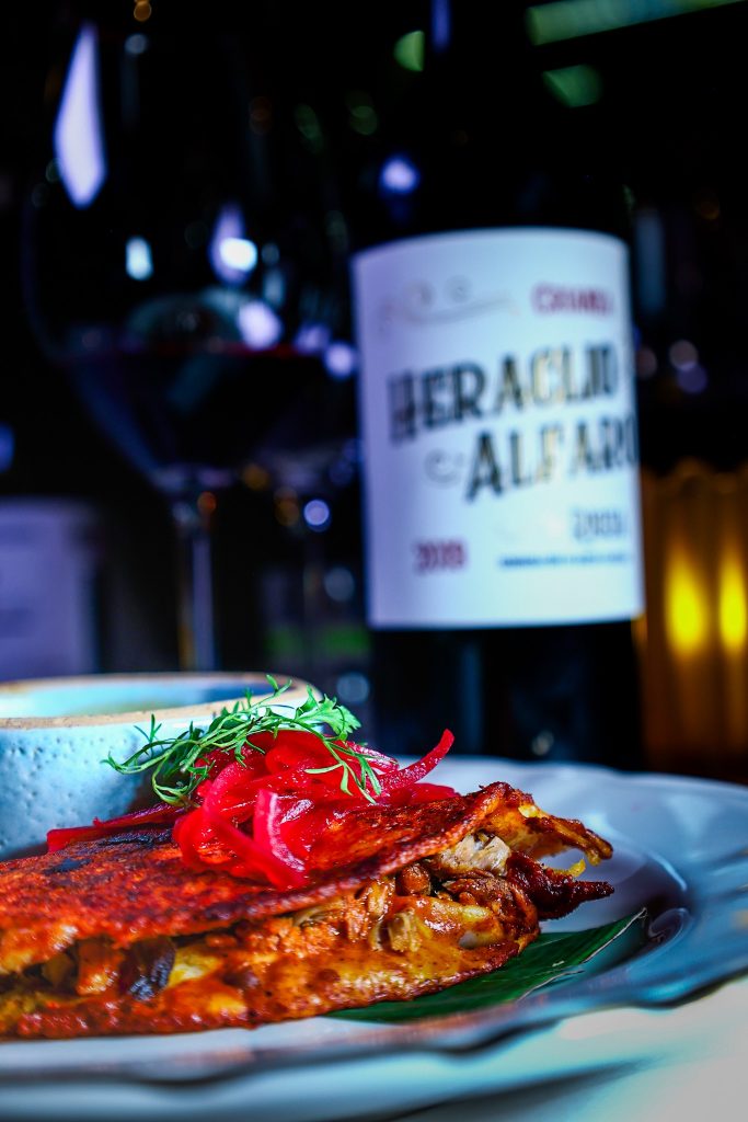 Para comenzar una croqueta de jaiba, de textura crujiente y sabores delicados, encontró su pareja en el LZ Genérico 2021, un vino fresco y mineral que aportó un contraste interesante y abrió apetito. Una quesa birria en segundo tiempo, con sus notas especiadas y el consomé untuoso, se maridan con el Heraclio Alfaro Crianza, cuyas notas de madera y especias amplificaron los sabores del plato.