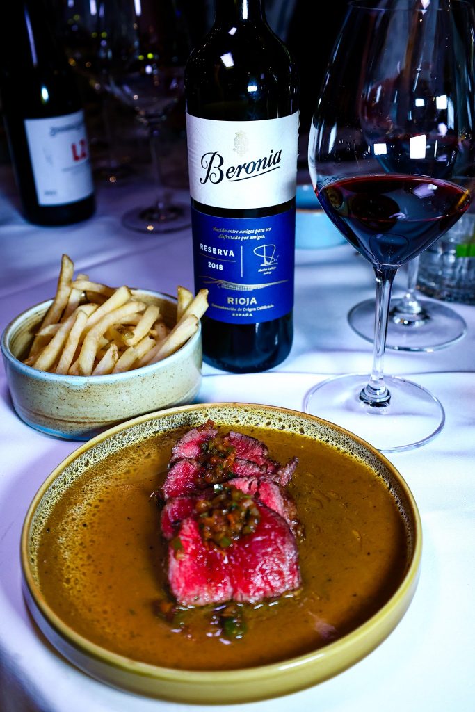 El filete arriero, fue el plato fuerte ideal con su salsa rica y especiada, fue acompañado por el Beronia Reserva, un vino de cuerpo medio y notas de cacao y vainilla que equilibraron cada bocado.