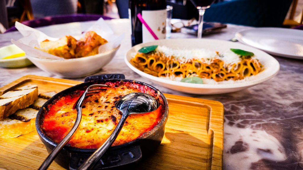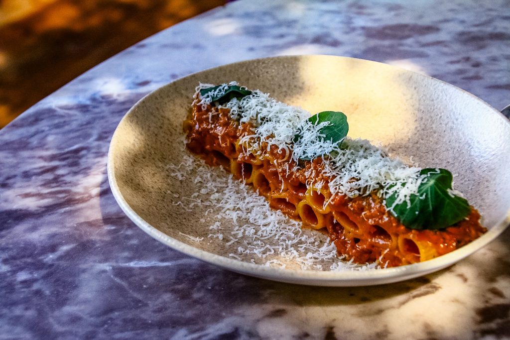 El protagonista de esta experiencia fue un vino de garnacha de Ortega Ezquerro, con su perfil frutal, especiado y una acidez bien equilibrada. Este vino acompañó dos platos: una berenjena al horno con pomodoro y provolone ahumado, donde las notas ahumadas del queso encontraron eco en los matices del vino; y un pappardelle con ragú de jabalí, cuyo sabor intenso fue balanceado por la estructura del vino. El resultado fue un maridaje que resaltó la rusticidad de los ingredientes y el carácter del vino.