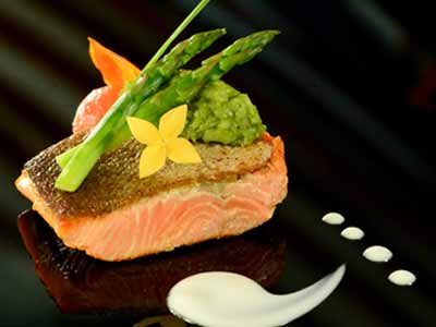 Colocar al centro del plato el puré de espárragos, encima disponer los medallones de langosta, los espárragos verdes colocarlos alrededor del puré; decorar con lechugas mixtas y salsear con la reduccion de oporto.