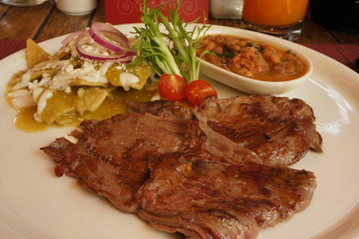 Un toque muy de la casa son las Enchiladas Moustaches con salsa verde, pollo, crema y queso gratinado. Entre los clásicos se incluyen la Machaca a la mexicana con frijoles refritos y tortillas de harina, la Arrachera Bistrot acompañada de chilaquiles, frijoles fronterizos y nopalito asado.