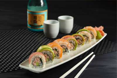 Asian Rainbow Roll: sorprendente combinación de rollos con láminas de salmón, atún, camarón y aguacate, rellenos de pepino y salsa Tampico.