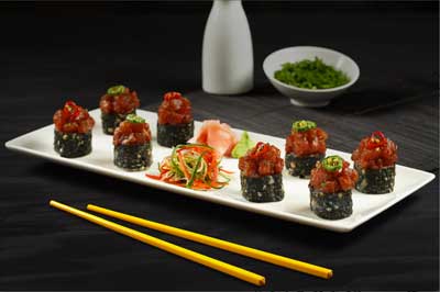 Dynasty: una receta única; tártara de salmón por fuera, relleno de queso crema, pepino y salsa chipotle.