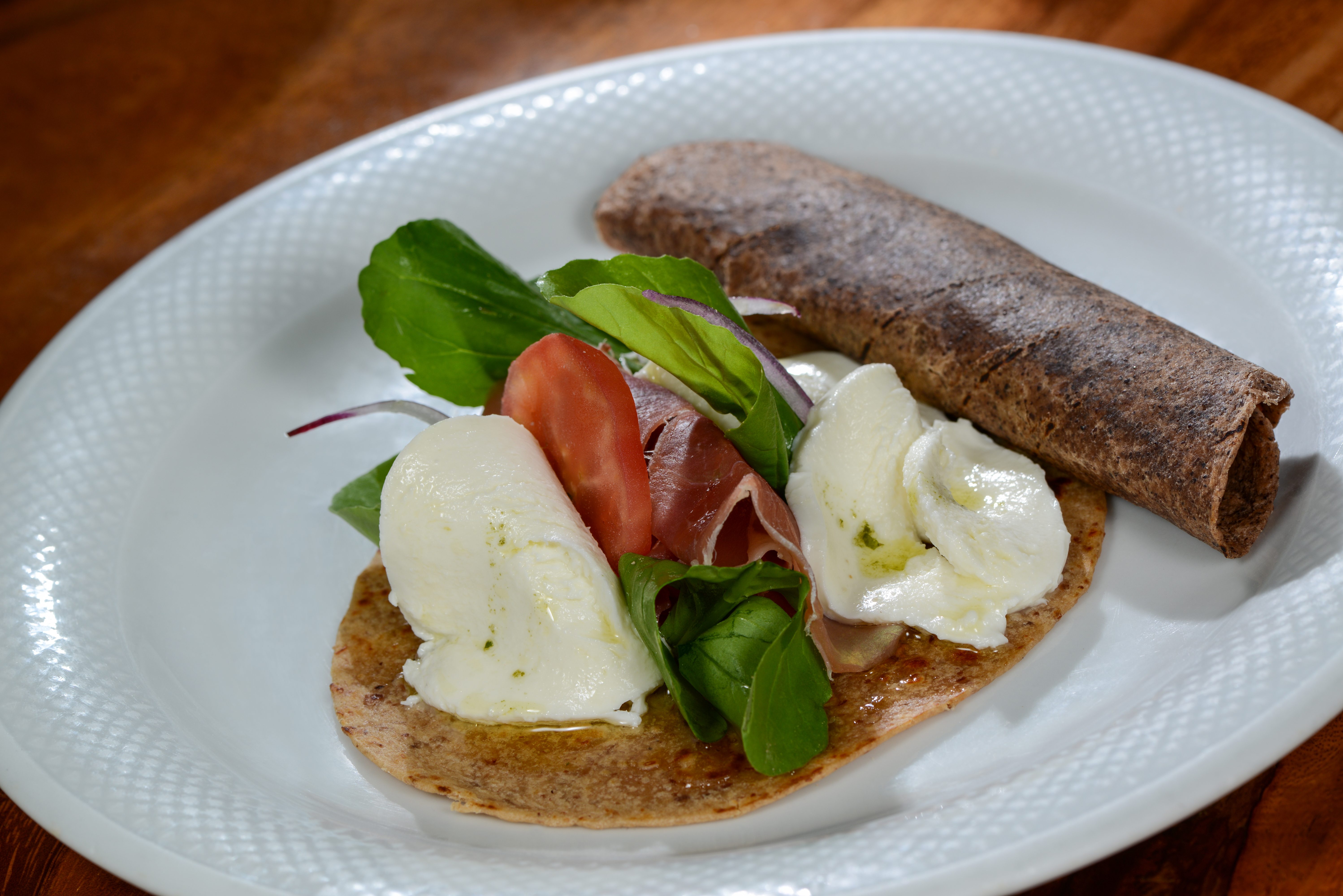 «]1. Calentar las tortillas y servir con jamón, mozarella, jitomate y arúgula.