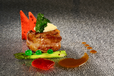 Colocar en el centro del plato la ternera, disponer una quenefa de puré de papa, al frente espárragos con esferificaciones de menta; salsear y decorar con crujiente de chaya.