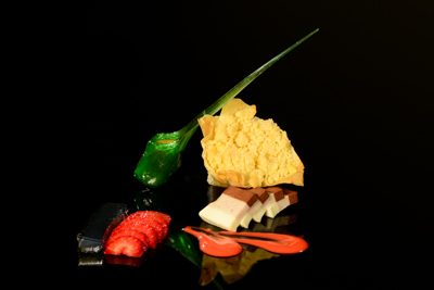 Colocar las tres texturas en medio y encima montar el crujiente de manzana, disponer la gelatina a un lado con una fresa y colocar la salsa en una decoración de azúcar.