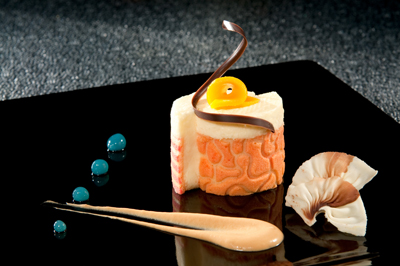 Colocar una base de bizcocho de avellana y encima el cremoso de vainilla, aplicar una espiral de chocolate y mango, a un lado disponer el caviar de curaçao y abanicos de chocolate, salsear con crema de avellana.