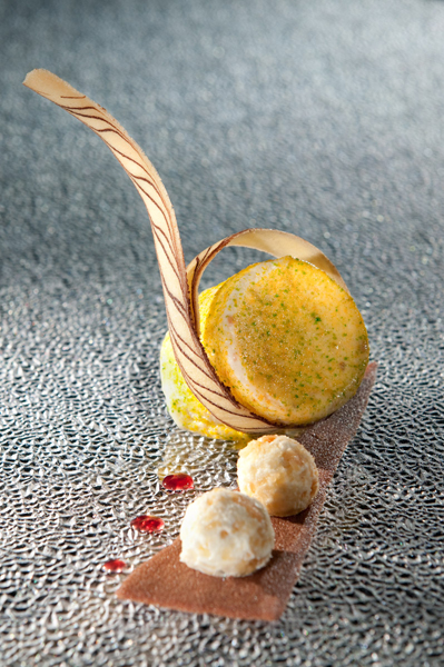 Colocar el crujiente en forma de círculo y al centro disponer el parfait. Poner el crujiente de chocolate en forma horizontal y 3 esferas de queso mascarpone a un lado, salsear con la reducción de oporto.
