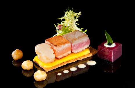 Cortar el atún y el salmón en cubos de 60 gramos. Salpimentar y marinar los mariscos con el aceite de hierbas finas, sellar en una sartén y refrigerar.