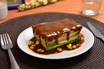 Coloca cuatro milanesas en la base de un refractario formando una capa. Coloca encima las calabacitas y los elotes. Baña con Mole Poblano con Chocolate Doña María® Listo para Servir y espolvorea con el queso manchego. Cubre con el resto de las milanesas y baña con más mole. Mete al horno durante 10 minutos a temperatura media o caliéntalo en el horno de microondas. Sirve de inmediato.