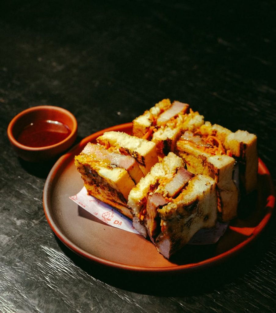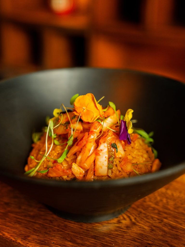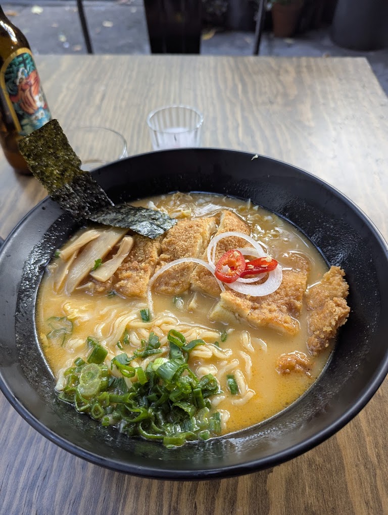 Después llegan los sandos como el de tori katsu, el de pork belly o el de cangrejo suave– que se sirven en pan brioche japonés y funcionan perfecto para compartir o como plato fuerte. La parte central de la carta es el apartado de ramen & noodles, donde aparecen versiones como el shoyu clásico, el red curry ramen, una opción vegana con caldo de verduras y el tori katsu ramen, además de preparaciones con udon y yakisoba. Cada tazón se arma con caldos profundos, vegetales, proteína y complementos como menma, huevo y brotes, lo que hace que la experiencia se sienta completa incluso con un menú corto.