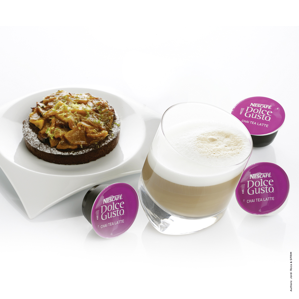 Consejo culinario: Acompaña estas tartas con NESCAFÉ DOLCE GUSTO Chai Tea Latte. Utiliza un chocolate amargo de buena calidad, que tenga mínimo un 70% de cacao.» ingredients=»Tarta de chocolate