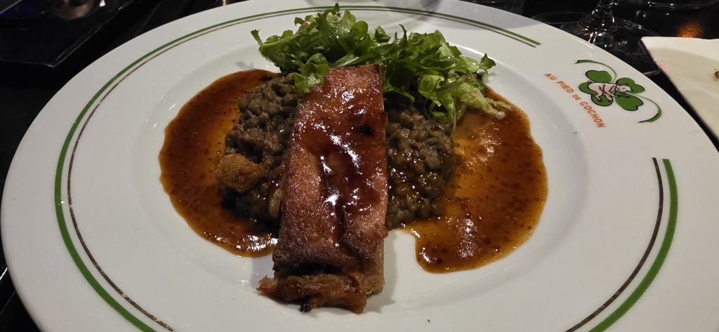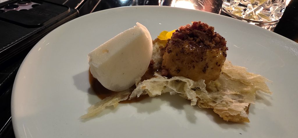 Uno de los tiempos fue el buta kakuni, cerdo cocinado en soya dulce y servido con pak choi, una preparación que sumó una capa de cocción pausada. Más adelante, la cena avanzó hacia un plato de mayor contundencia con el cerdo confitado y laqueado con lentejas guisadas, cromesquis de foie gras y jugo dulce a la mostaza antigua, una combinación donde la intensidad del cerdo encontró equilibrio con el resto de los elementos del plato.