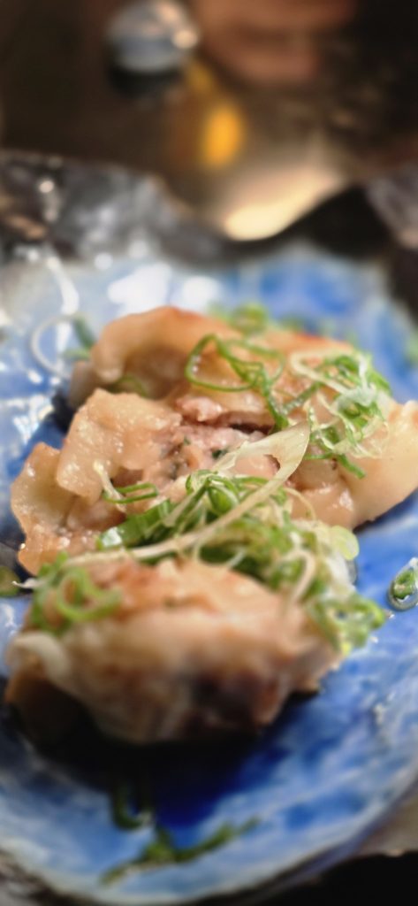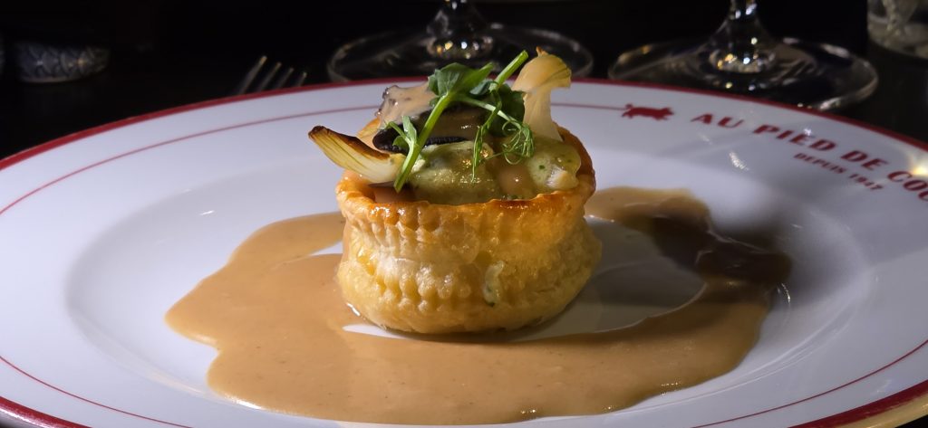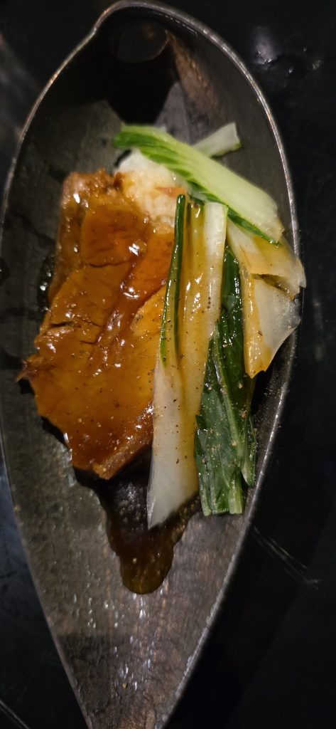 La cena comenzó con una bouchée de cerdo y caracoles con verduras salteadas y confitadas, una entrada que abrió la noche con una combinación de sabores profundos y una estructura más clásica. Después llegaron las gyozas de cerdo al vapor, que aportaron un momento más ligero dentro del menú, sin perder el sabor del ingrediente principal.